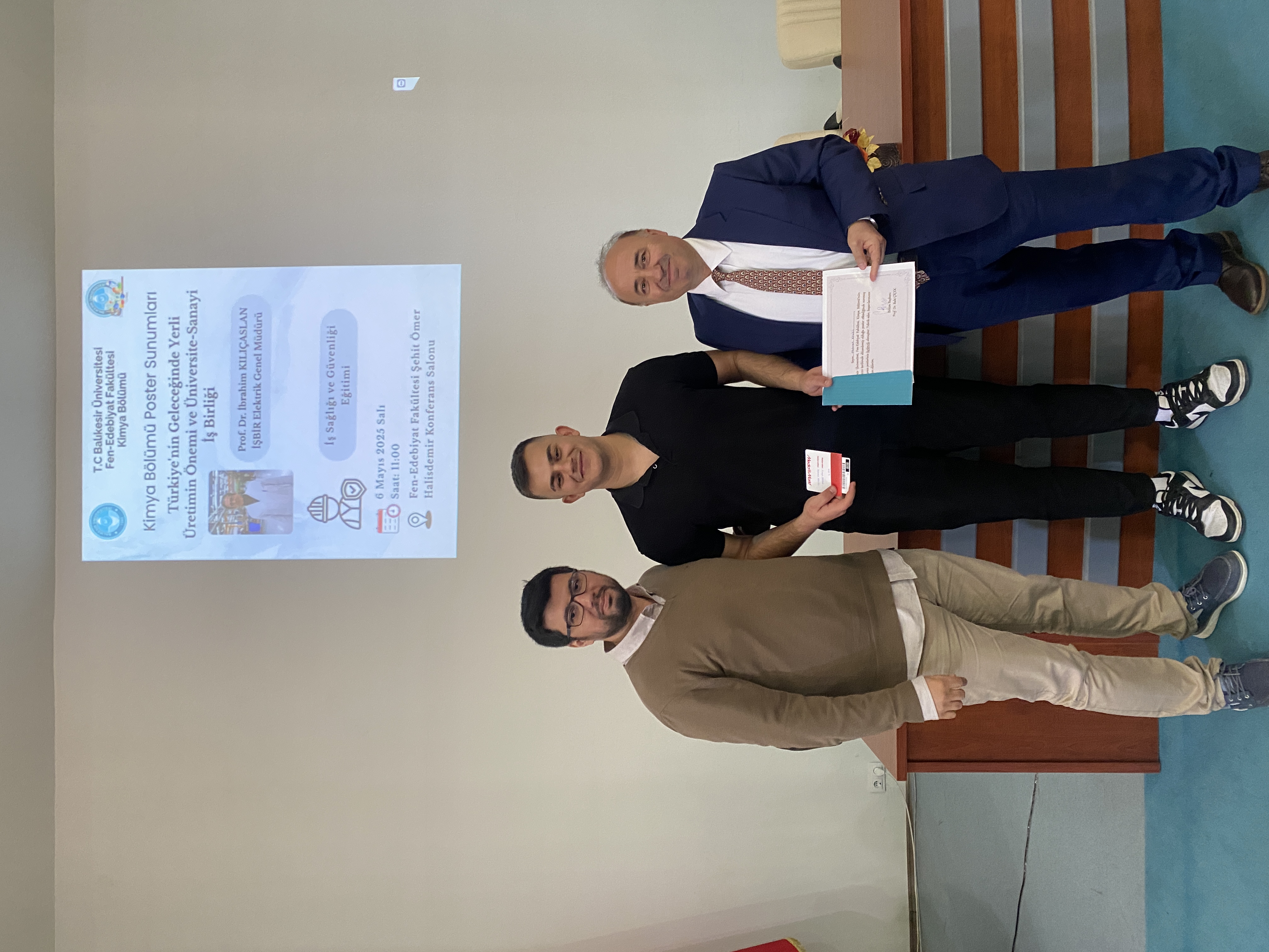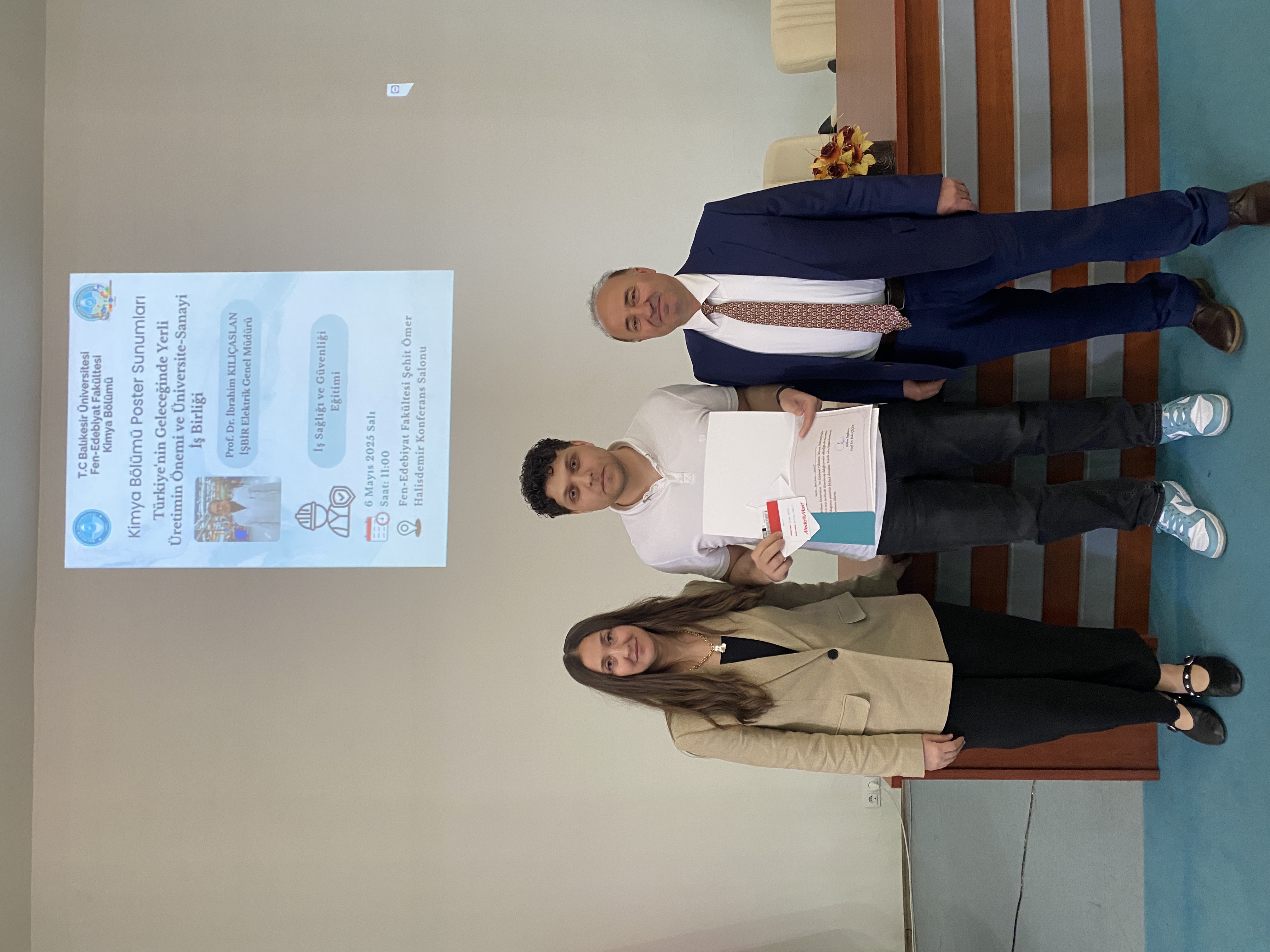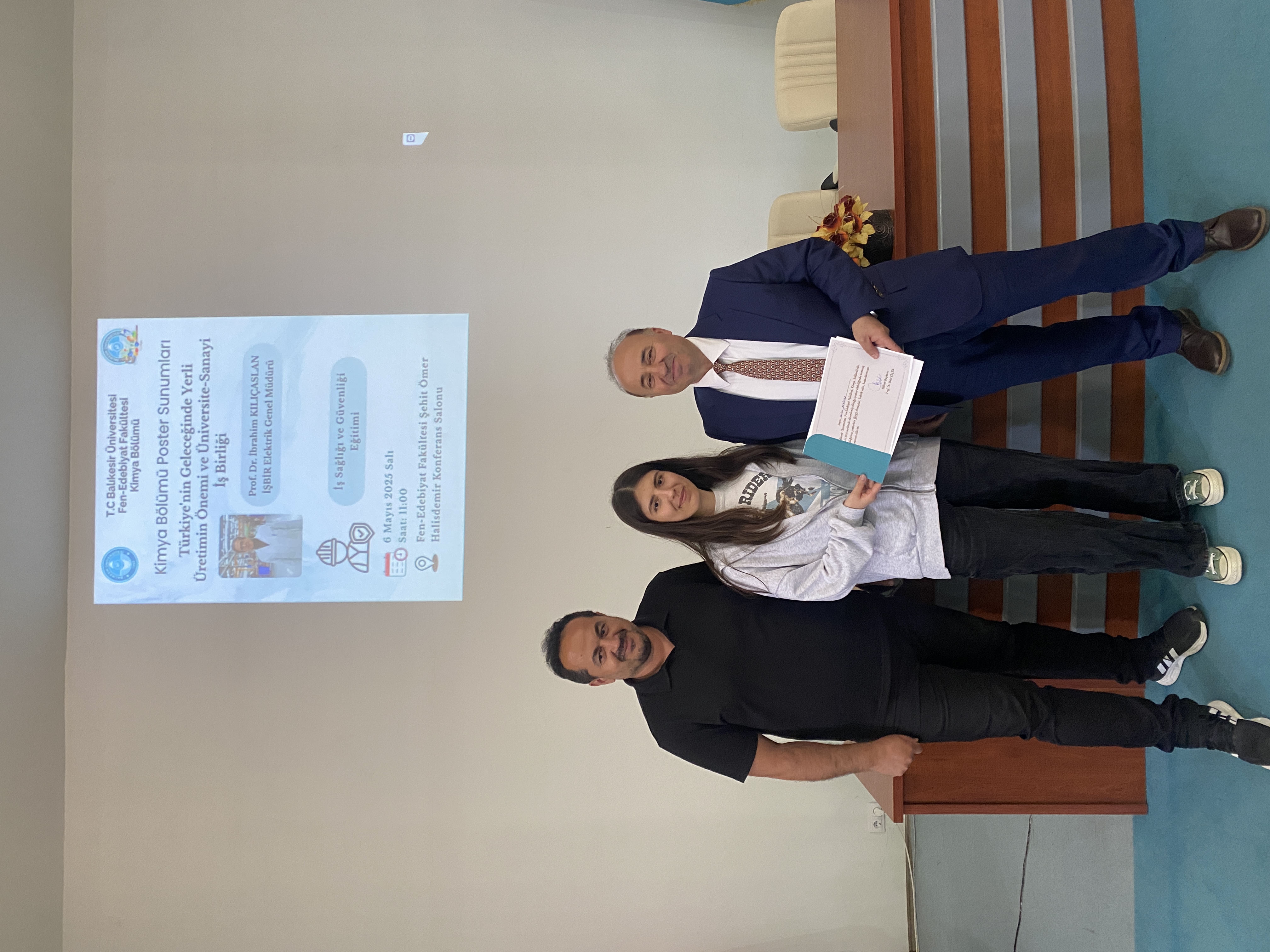 Balıkesir Üniversitesi Fen-Edebiyat Fakültesi Kimya Bölümü'nün geleneksel Poster Sunum Etkinliği bu yıl da yoğun ilgi gördü. Balıkesir Üniversitesi Rektörü Prof. Dr. Yücel Oğurlu, beraberinde Rektör Yardımcıları Prof. Dr. Cevdet Avcıkurt ve Prof. Dr. Fatih Satıl ile beraber poster alanını dolaşarak öğrencilerden projeleri hakkında ayrıntılı bilgiler aldı. Heyette Fen-Edebiyat Fakültesi Dekanı Prof. Dr. Halil İbrahim Şahin, Dekan Yardımcıları Prof. Dr. Aylin Er ve Prof. Dr. Fırat Evirgen ile Kimya Bölüm Başkanı Prof. Dr. Baki Çiçek de yer aldı; bölüm akademisyenleriyle yapılan canlı tartışmalar etkinliğe bilimsel bir dinamizm kattı.